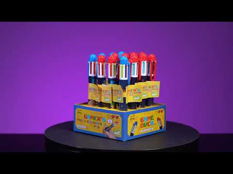 Level up your writing with this novelty gamer pen! Features pixel icons with text that reads 'Game Over'. With 6 colours to write with: black, blue, red, orange, green, purple.
