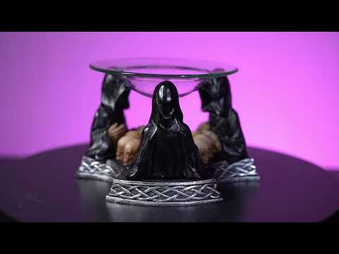 Spooky grim reaper oil burner with glass dish. Tealight holder surrounded by skulls. Features a Celtic knot pattern around the base edge.