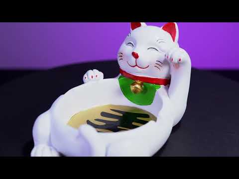 Cute cat ashtray, perfect to express your personal style. Shaped like a waving lucky cat and designed in a traditional white colour with red accents, a green bib and golden bell. This ashtray makes a unique gift or a fun novelty homeware for yourself! Stick your butts in the cat's belly and keep ash and cigarettes contained.